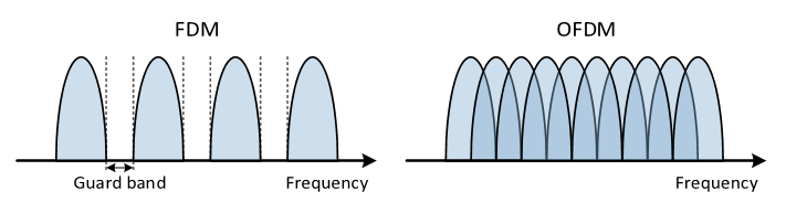 하지만 FDM은 subcarrier간의 간섭을 억제하기 위해 guard band를 설정하여야 했기 때문에 대역폭 효율이 떨어진다는 특징을 가지고 있습니다. 따라서 FDM의 단점을 극복하기 위해 OFDM은 subcarrier로 나눠 전송 시 guard band 없이도 서로 간의 간섭을 일으키지 않도록 직교성(orthogonality)을 이용하는 전송 기법입니다.