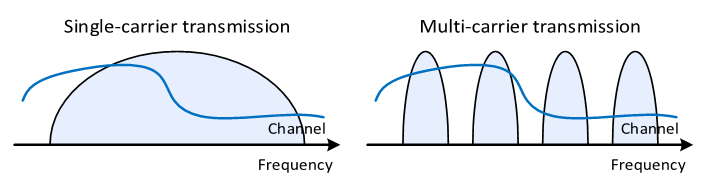 OFDM (orthogonal frequency division multiplexing)은 하나의 캐리어를 직교(orthogonal)하는 여러 개의 subcarrier로 나눠 이를 중첩하여 전송하는 multiplexing 기법입니다. 기존의 단일 캐리어 전송은 넓은 대역폭으로 인해 multipath fading으로 인한 ISI (inter-symbol interference)를 복구하기 어렵다는 특징을 가지고 있습니다. 이를 위해 캐리어를 여러 개의 subcarrier로 나눠 전송하는 FDM (frequency division multiplexing) 기법이 사용되었고, subcarrier의 대역폭 안에서는 채널이 flat하게 보이므로 채널에 의한 ISI 효과를 제거하기 쉬워졌습니다.