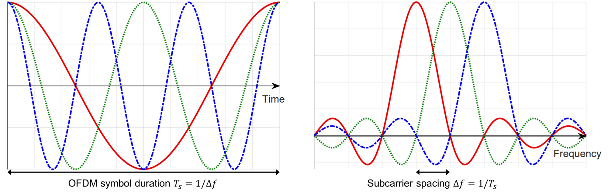 직교하는 subcarrier $\phi_k$의 실수 부분을 시간 영역과 주파수 영역에서 보면 [그림 3]과 같습니다. 시간 영역에서 보면 각기 다른 주파수의 cosine 신호가 중첩되어 하나의 OFDM waveform을 구성합니다. Subcarrier $\phi_k$는 구간 $[0,T_s]$에서 sinusoidal 신호에 rectanglar pulse가 씌워져 있는 형태이므로 주파수 영역에서는 sinc 함수의 frequency-shift 된 형태가 됩니다. 오른쪽의 주파수 영역 그림에서 보면 각 subcarrier의 중심 주파수에서는 다른 subcarrier 성분들이 0이 되는 것을 알 수 있습니다.